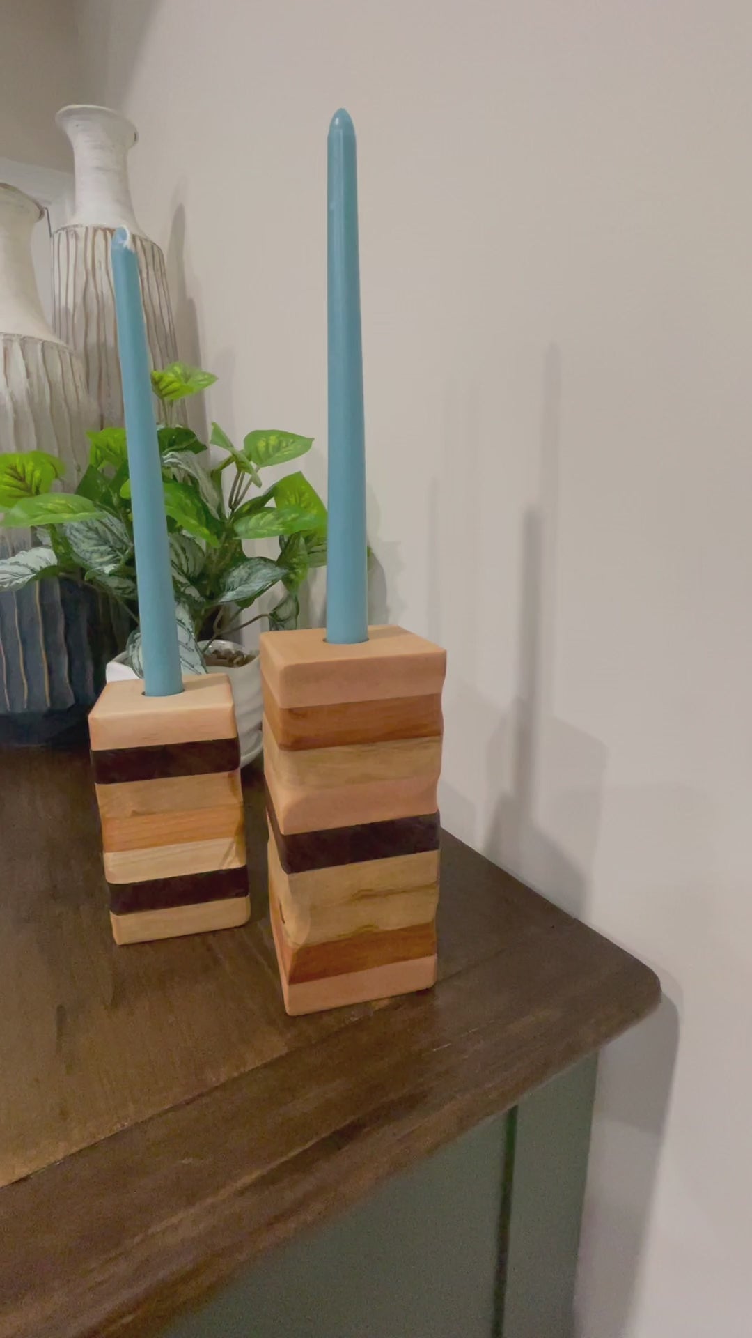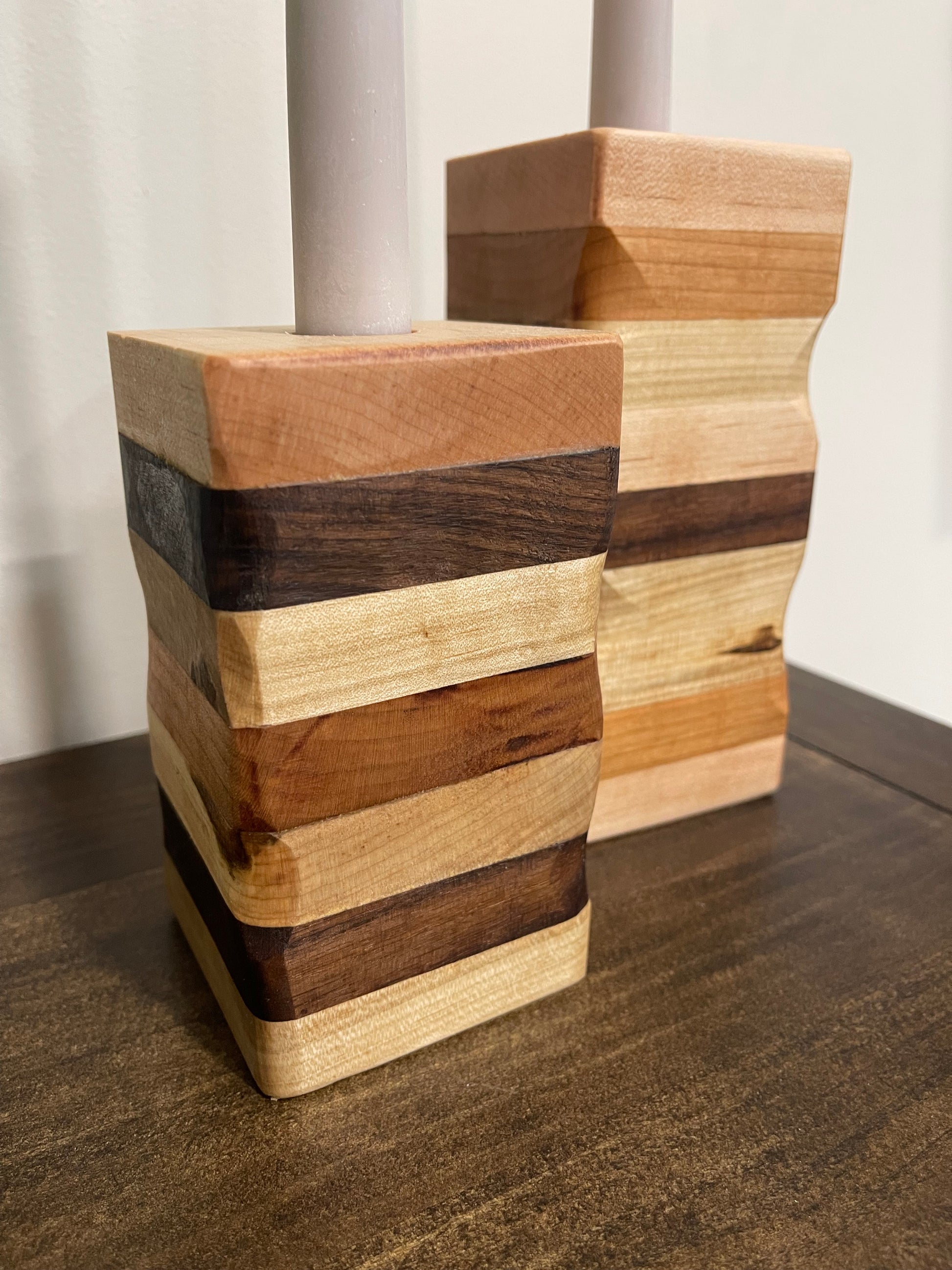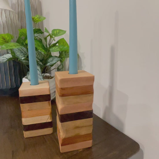 Illuminate your space with this exquisite set of two handcrafted candle holders, each a one-of-a-kind creation. Expertly made from premium cherry, walnut, and maple, these pieces showcase the natural beauty and rich grain patterns unique to each wood. The taller holder stands at 6.75 inches while its companion reaches 5.25 inches, offering versatile display options. Every set features distinct wood orientations and patterns, ensuring no two sets are identical. Perfect for adding warmth and artisanal character to any room, these holders celebrate the timeless appeal of fine woodworking craftsmanship.