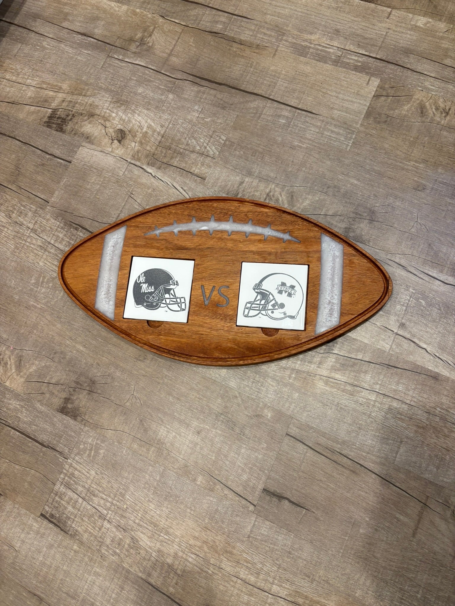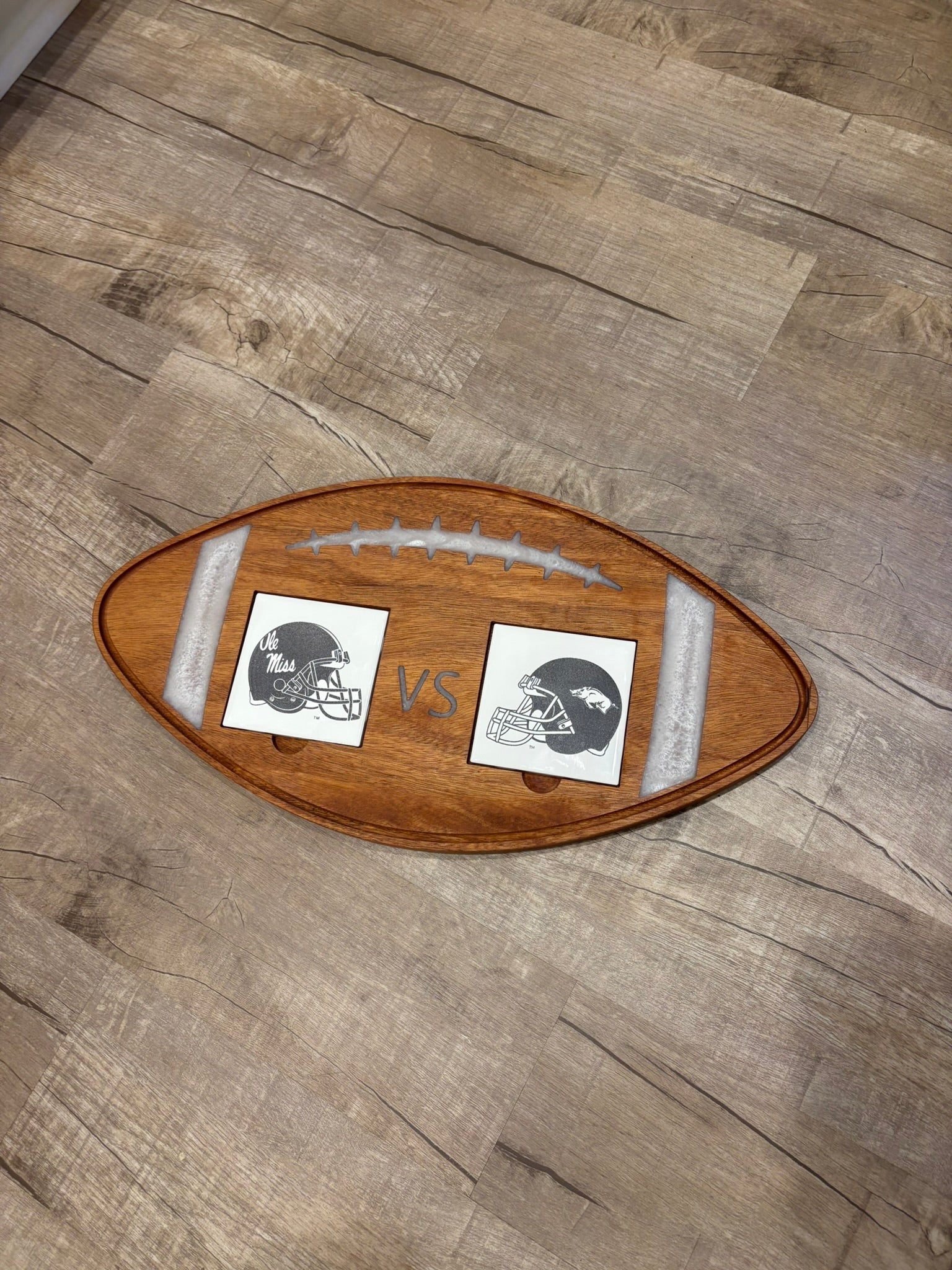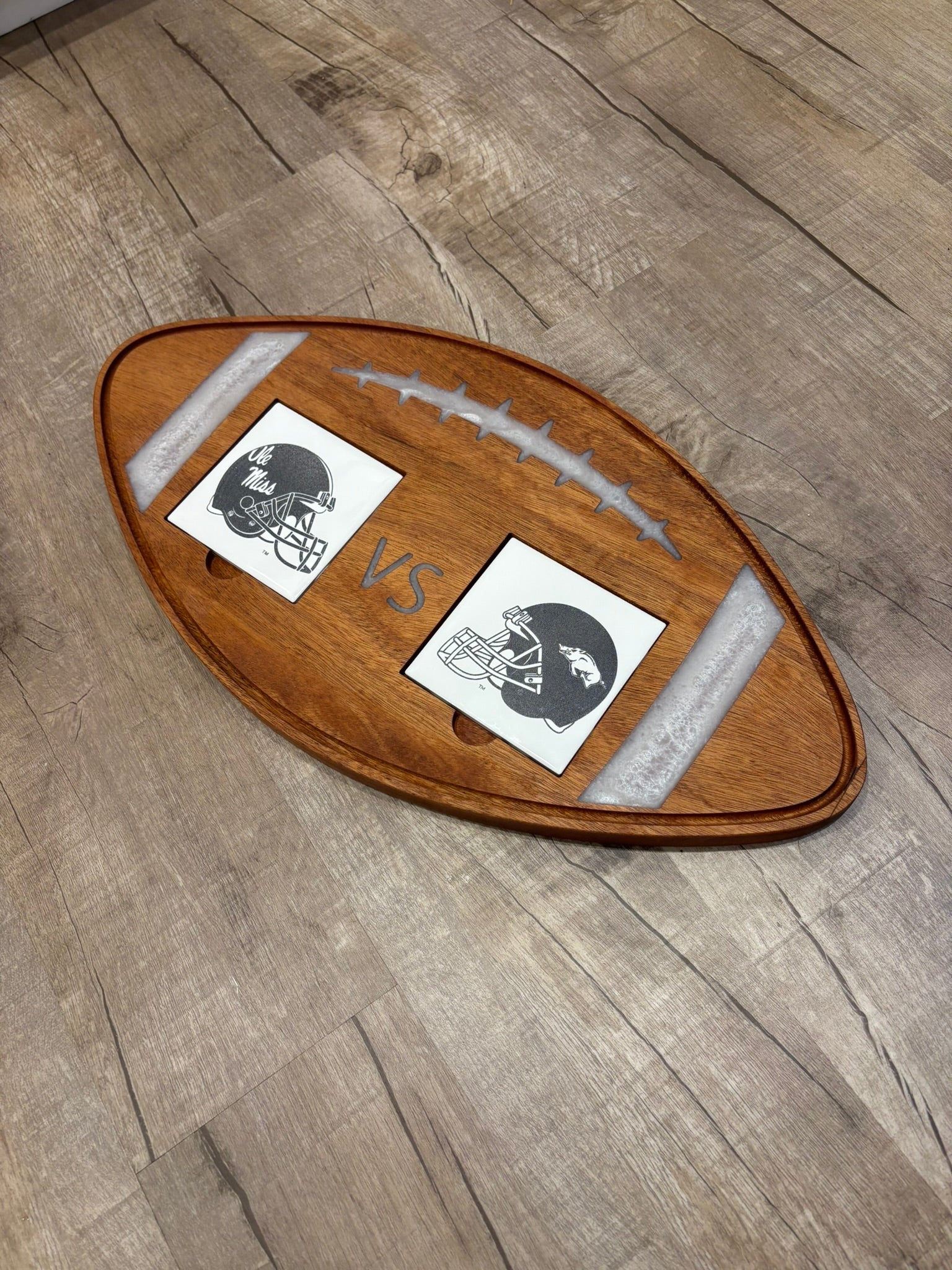 Elevate your game day with this Football Serving Tray, designed for fans who love to entertain. Crafted from rich cherry wood with a durable epoxy inlay, it measures approximately 11.5 x 22 inches and is about 1 inch thick, offering ample space for snacks or charcuterie. Each tray includes two ceramic tile coasters customized with the team helmets of your choice, making it a perfect centerpiece for any sports gathering. Finished with a food-safe oil, it’s both beautiful and practical—simply hand wash under running water to keep it looking great. Score big on style and function with this unique serving board.