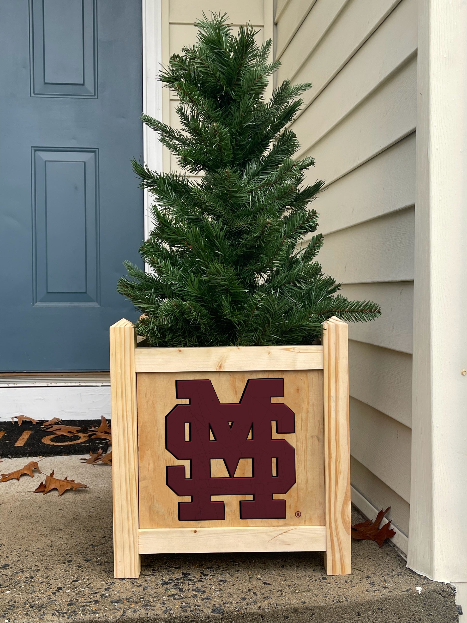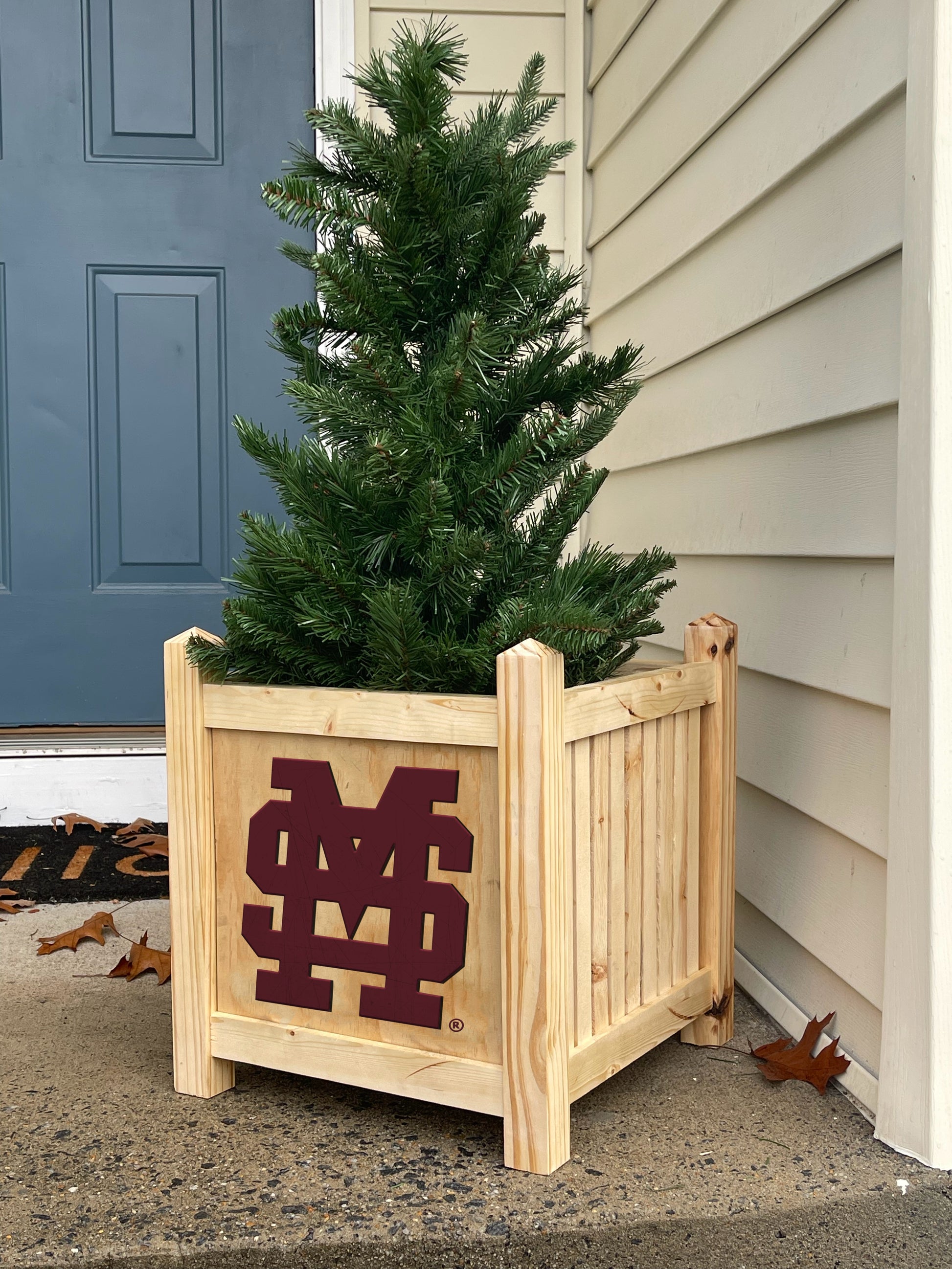 This handmade wooden planter box is made from pine with the MS State team logo laser cut on the front side and slats on the other three sides. The planter measures 15" x 15" x 17" tall and makes it ideal for growing your potted flowers, herbs, or decorative plants. Protected with a clear outdoor stain, the planter offers exceptional protection against the elements, ensuring your planter stays beautiful year after year.